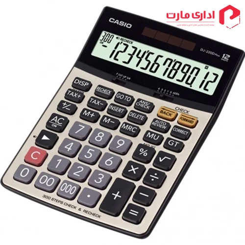 ماشین حساب مدل (DJ-220D Plus) به ابعاد (۱۰۵×۱۴۴×۲۶.۲) میلی متر و تنها با ۱۷۵ گرم وزن از سری محصولات با کیفیت برند معتبر کاسیو به شمار می رود و از آنجایی که به صورت رومیزی طراحی شده برای مصارف حسابداری دفتری و اداری گزینه مناسبی محسوب می شود.
