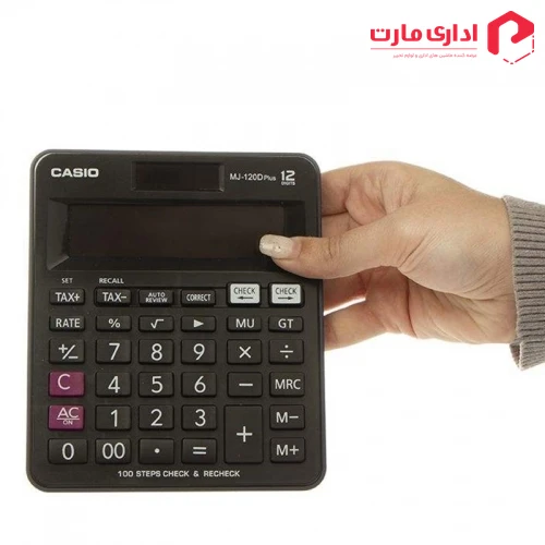 ماشین حساب کاسیو مدل (MJ-120D PLUS) یکی از ماشین حساب های کاربردی کمپانی کاسیو می باشد که مناسب برای استفاده های فروشگاهی و دفتری می باشد این محصول انرژی خود را از طریق باتری از نوع LR44 و پنل خورشیدی تأمین می کند که اگر در محیط پر نور باشد نیاز به باتری هم نخواهد داشت از قابلییت های بارز این ماشین حساب رومیزی باید به کنترل محاسباتی تا ۳۰۰ مرحله اشاره کرد که نگرانی کاربر را از بابت درستی محاسبات رفع می کند تعداد کاراکتر های پشتیبانی کننده این محصول تا ۱۲ عدد است که برای انجام محاسبات طولانی نیز مناسب است در (MJ-120D PLUS) کلید دو صفر نیز تعبیه شده است که برای ورود اعداد بزرگ می توانید از آن استفاده کنید این محصول از صفحه نمایش بزرگ بهره می برد که کارکردن با آن را راحت می کند، محصول از آلارم RECHECK پشتیبانی می کند که در صورت اشتباه در مرحله دوم محاسبات بوق اخطار به صدا در می آید و کاربر را آگاه می سازد.