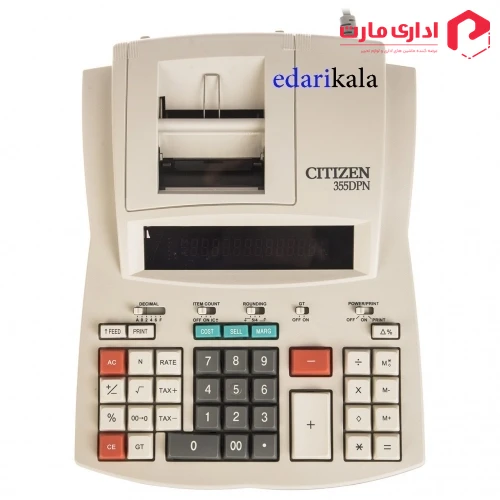 ماشین حساب 355DPN سیتیزن برای امور حسابداری است. این ماشین حساب صفحه نمایش یک خطی ۱۲ رقمی دارد. تبدیل نرخ ارز، بررسی و اصلاح از ویژگی های آن محسوب می شود. چاپ دو رنگ در 355DPN امکان پذیر است. کلید های روی این ماشین حساب کیفیت خوبی دارند و همانند صفحه کلید کامیپوتر طراحی شده است. شرکت سیتیزن سه کلید حافظه، TAX+، TAX، دو صفر ، GT، هزینه، فروش و حاشیه را برای برای پیشبرد سریع امورات کاربر در 355DPN تعبیه کرده است. این دستگاه ابعادی برابر با 300x220x70 میلی متر دارد. منبع تغذیه این ماشین حساب از برق است.خرید ماشین حساب 355DPN سیتیزن با قیمت مناسب در اداری مارت.