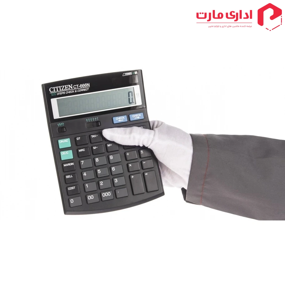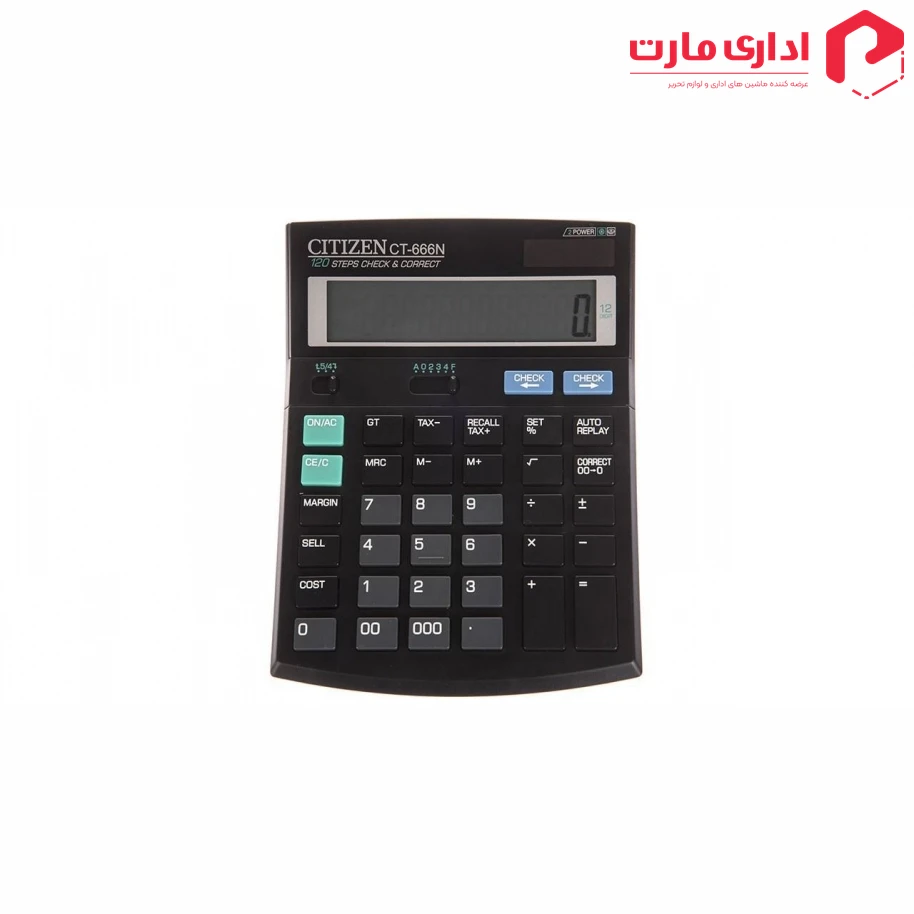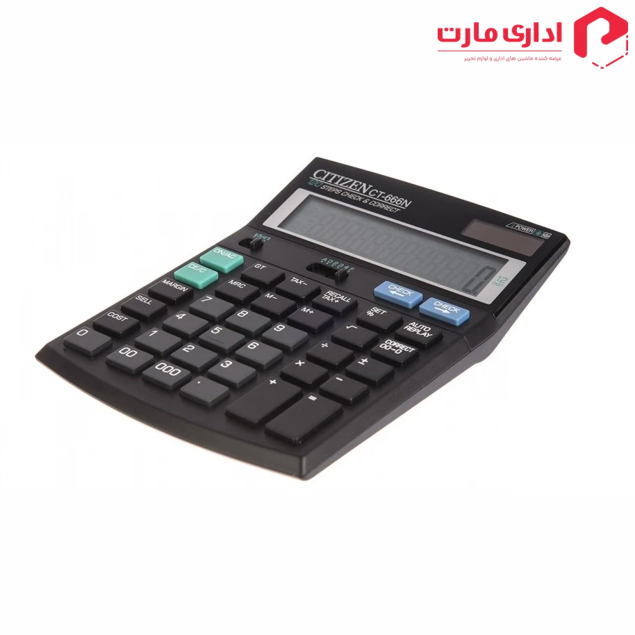 ماشین حساب مدل (CT-666N) سیتیزن، این ماشینحساب صفحه نمایش یکخطی ۱۲ رقمی دارد، برای تأمین برق مصرفی این ماشینحساب، دو منبع باتری و پنل خورشیدی در نظر گرفته شدهاند که درنتیجهی آن باتری تنها برای مواقع ضروری مانند تاریکی مورداستفاده قرار میگیرد و در باقی موارد در صورت روشنایی کافی محیط، دستگاه نور محیط را جذب و به نیروی موردنیاز خود تبدیل میکند، با بهره مندی از ویژگی خاموش خودکار، دستگاه در مواقعی که مورداستفاده قرار نمیگیرد، خاموش میشود، کلید دو صفر، سه صفر، TAX+، TAX-، GT، سه کلید حافظه، تابع ریاضی ریشه دوم، هزینه، فروش، بررسی و اصلاح این ماشینحساب را به دستگاهی مناسب برای حسابداران فروشگاه تبدیل کرده است، کلیدها از دوام خوبی برخوردار هستند و تنها چند میلی متر از سطح ماشین حساب فاصله دارند، ترکیب رنگ بندی سبز و آبی در کنار مشکی مات باعث جذابیت و زیبایی CT-666N شده است.
