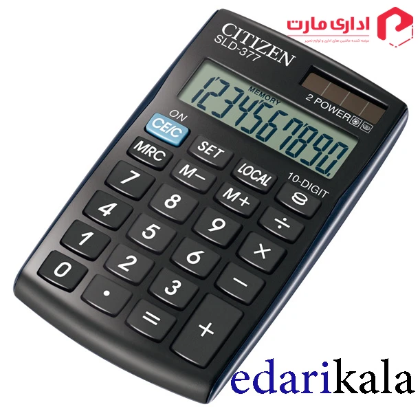 ماشین حساب SLD-377 سیتیزن با صفحهنمایش ۱۰ رقمی است. صفحهنمایش یک خطی این دستگاه ارقام را درشت به نمایش میگذارد و از زاویه دید خوبی برخوردار است. برای تأمین برق مصرفی این ماشینحساب، دو منبع باتری و پنل خورشیدی در نظر گرفته شدهاند که درنتیجهی آن باتری تنها برای مواقع ضروری مانند تاریکی مورداستفاده قرار میگیرد و در باقی موارد در صورت روشنایی کافی محیط، دستگاه نور محیط را جذب و به نیروی موردنیاز خود تبدیل میکند. برای صرفه جویی در مصرف باتری از حالت خاموش خودکار بهره می برد. ماشین حساب SLD-377 دارای سه کلید حافظه و تبدیل ارز است. ابعاد 105x64x9 میلی متری و وزن ۴۱ گرمی این ماشین حساب را به محصولی جمع و جور تبدیل کرده است تا با حمل آن مشکلی نداشته باشید. تناسب ابعاد کلی دستگاه در مقایسه با کلیدها متناسب است.خرید ماشین حساب SLD-377 سیتیزن با قیمت مناسب در اداری مارت.