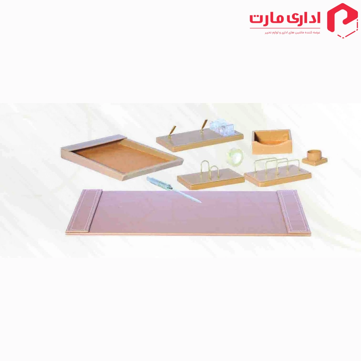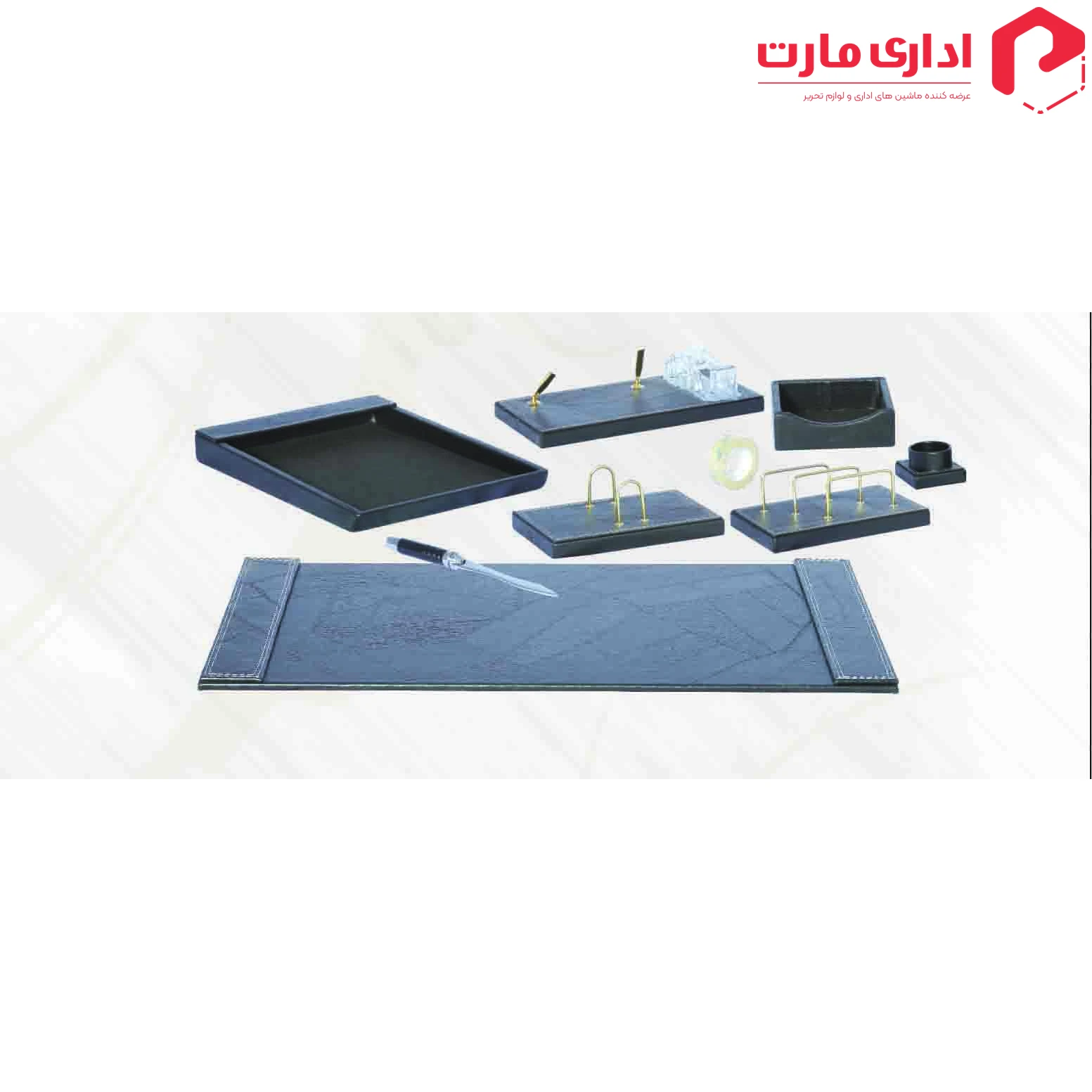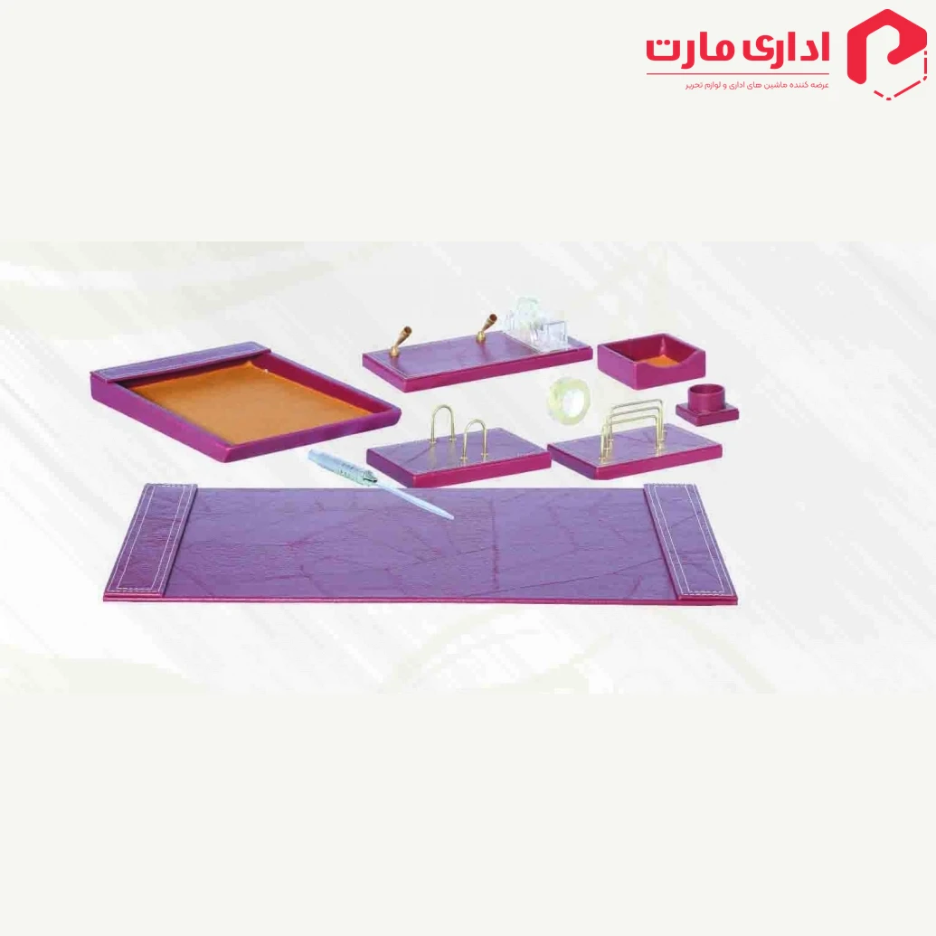 این مجموعه دارای: کارد باز کردن نامه، جای پاکت نامه، پد رومیزی، کازیه،جای تقویم رومیزی،جای چسب ، جای کارت،جای یادداشت و جا قلمی می باشد.