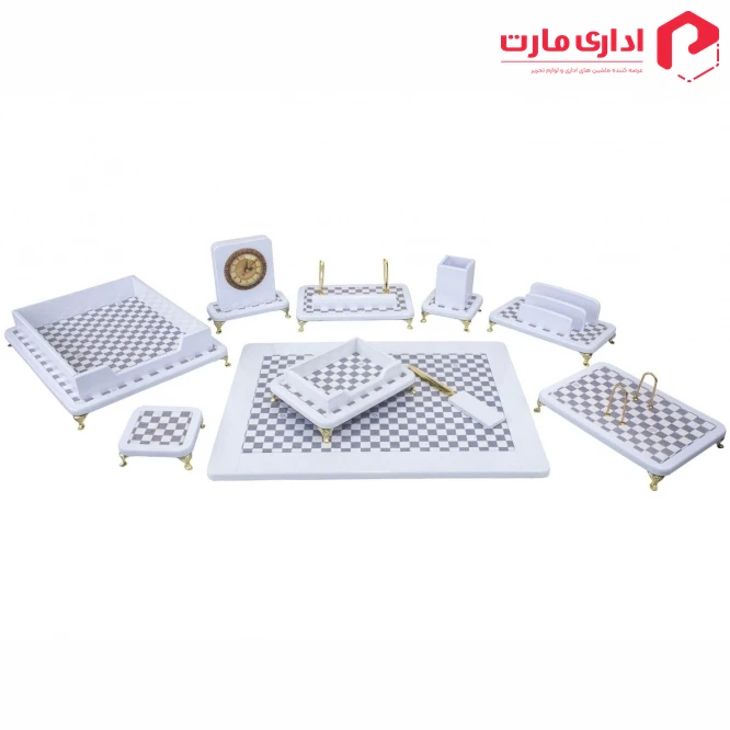 این ست رومیزی همانطورکه گفتیم دارای ۱۰ تیکه متشکل از مواردی همچون جامدادی رومیزی، پاکت بازکن، جای تقویم رومیزی، پد رومیزی، جای کارت ویزیت، زیر لیوانی، جای پاکت نامه، ساعت رومیزی، جا قلمی یا خودکاری و کازیه تک طبقه می باشد.